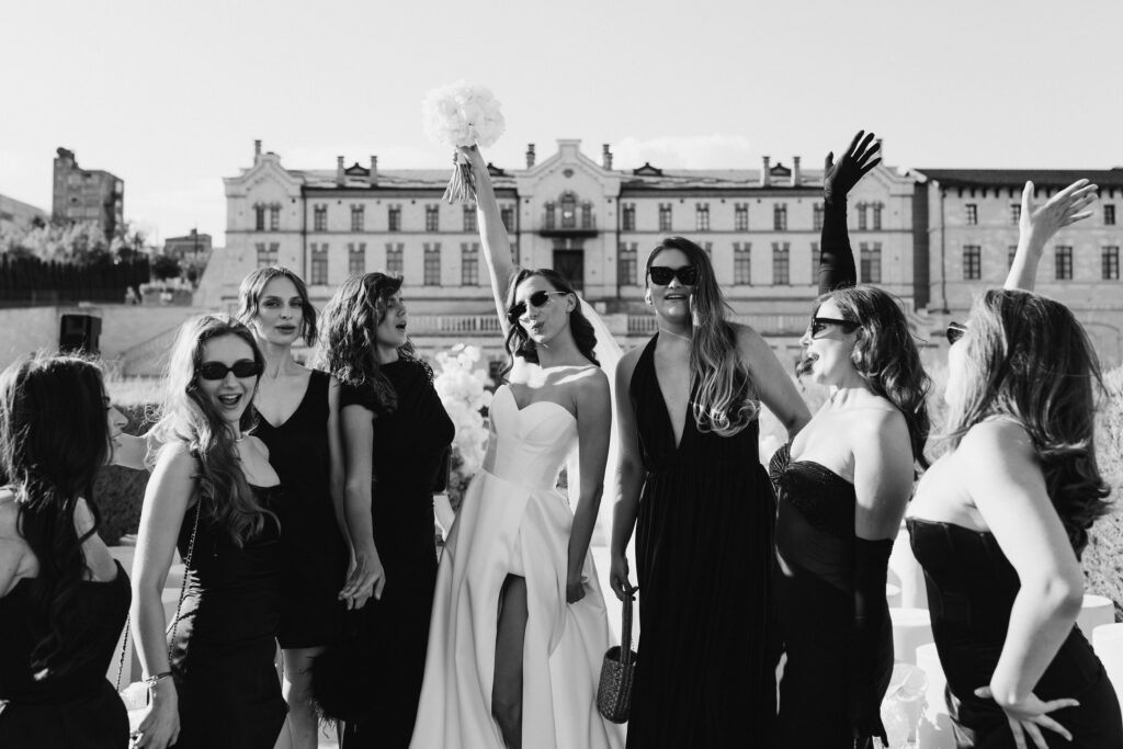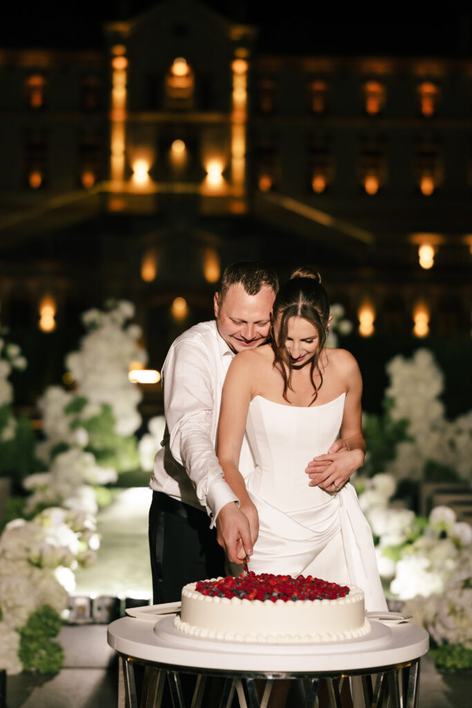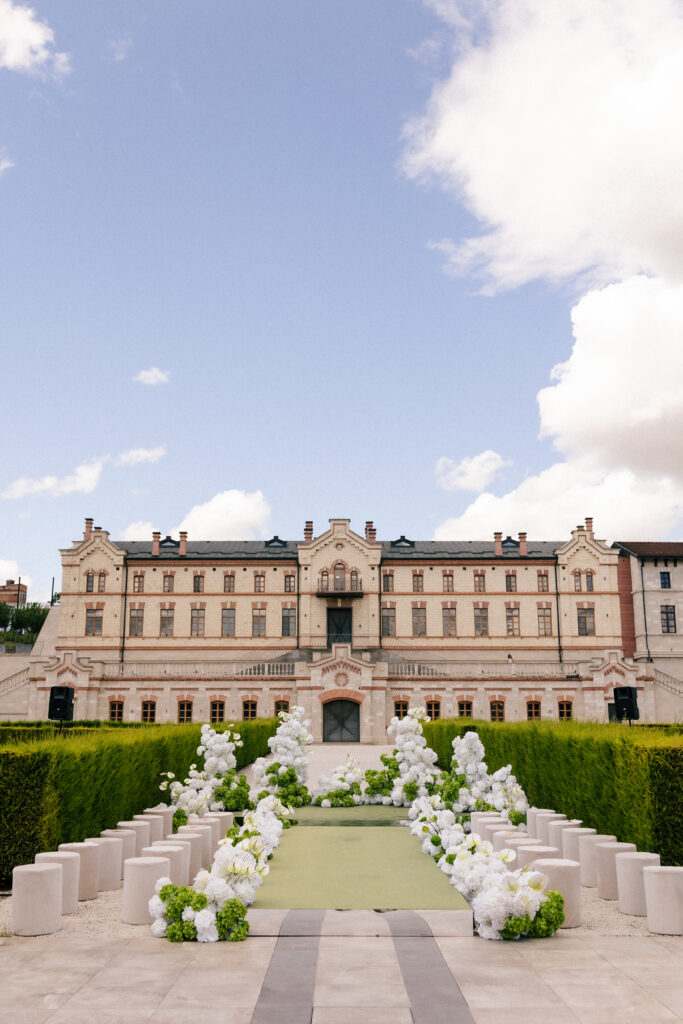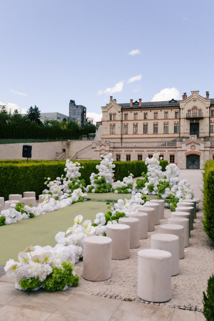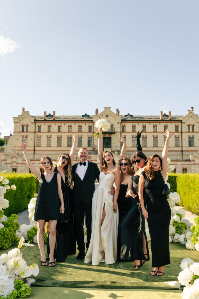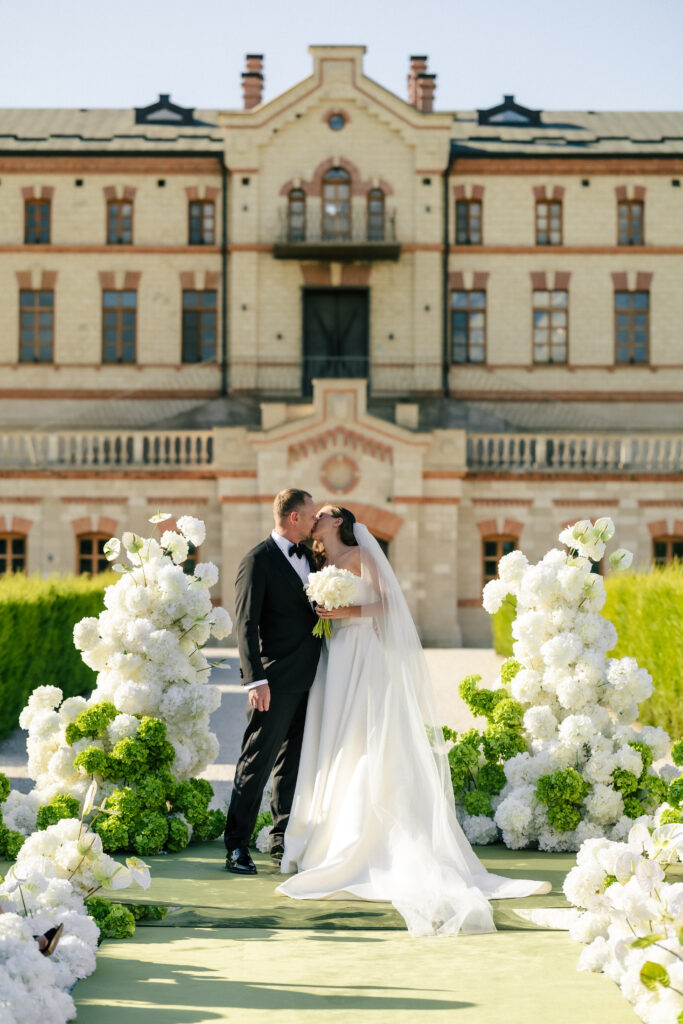 Весілля Володимира та Олесі стало справжньою казкою, що розгорнулася у величному замку-виноробні в Молдові. Церемонія відбулася просто неба серед найближчих друзів пари, які прилетіли з усього Світу, щоб святкування їх кохання. Гості, одягнені у бездоганний дрес-код, виглядали так, ніби зійшли зі сторінок романтичного фільму. Урочиста вечеря пройшла у залі серед безлічі живої зелені та понад 700 свіжих гортензій. Це весілля стало не просто святом — а справжньою історією кохання, зануреною у витончену елегантність та естетику.